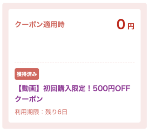 さらに、クーポンが「501円以上から利用可」の場合、60円前後の激安商品を一緒にカートへ入れて金額を調整することで、実質10円で視聴できます。