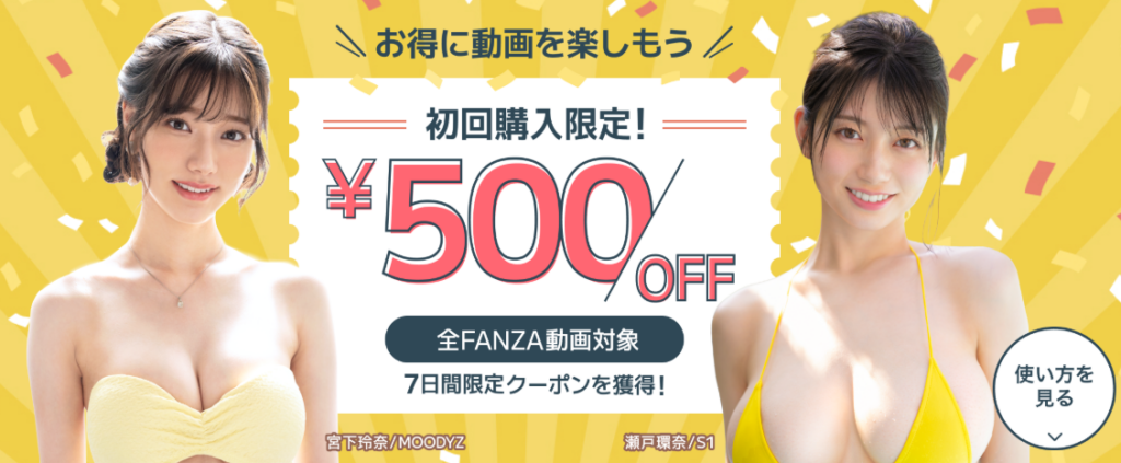 FANZAの初回購入限定・500円オフクーポンを活用すれば、対象作品を実質0円で視聴できます!